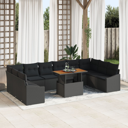 vidaXL Zestaw Sof Ogrodowych Zestaw 11 Czarny Rattan, Drewniany Blat