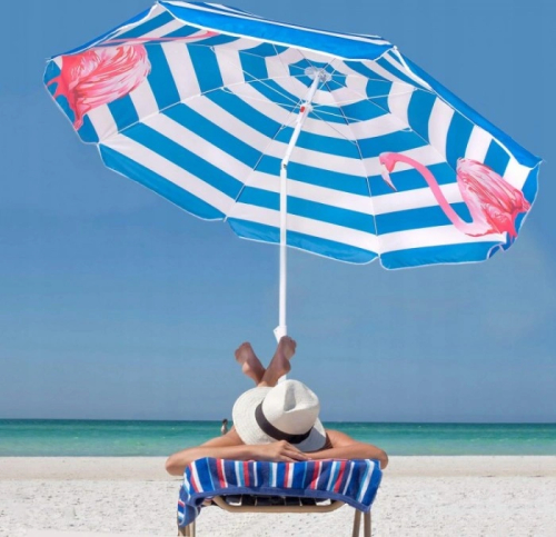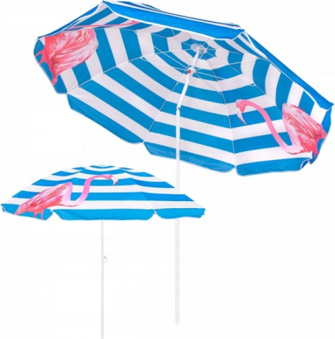 Купол зонта диаметром 180 см разделён на 8 секций и усилен стальными спицами, обеспечивающими прочность и устойчивость. Механизм складывания и раскладывания простой и удобный в использовании. Благодаря системе наклона стойки и заострённому наконечнику, зонт можно легко установить в песок или грунт без дополнительных подставок. Стильный принт с розовым фламинго придаёт зонту оригинальный и яркий вид. Компактно складывается и занимает минимум места в багажнике автомобиля, что удобно для транспортировки.