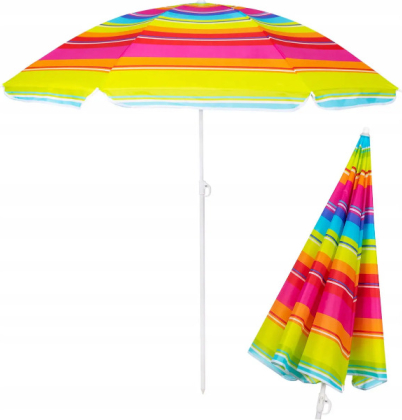 Диаметр зонта составляет 160 см. Купол разделен на 8 секций и усилен стальными спицами. Механизм складывания/раскладывания интуитивно понятный и легкий в использовании. Зонт дополнен заостренным наконечником, поэтому его можно установить в песок или грунт без дополнительных подставок. Он компактно складывается и не занимает много места в багажнике во время транспортировки.