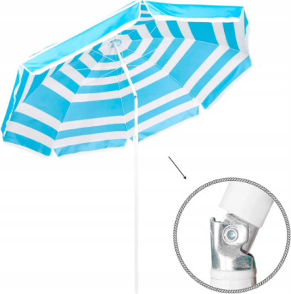 Диаметр зонта составляет 220 см. Купол разделен на 8 секций и усилен стальными спицами. Механизм складывания/раскладывания интуитивно понятный и легкий в использовании. Зонт дополнен системой наклона стойки и заостренным наконечником, поэтому его можно установить в песок или грунт без дополнительных подставок. Он компактно складывается и не занимает много места в багажнике во время транспортировки.