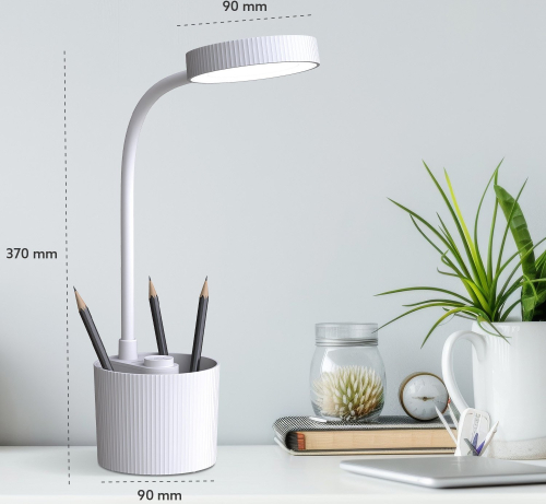Настольная LED-лампа Forever Light PURE FLB-20 AGNES сочетает минималистичный дизайн и функциональность рабочего места. Встроенный держатель для ручек/карандашей и регулируемое плечо лампы делают её пригодной для учебы, работы и домашнего использования. Светодиод с мощностью 5 Вт обеспечивает достаточное освещение для задач и атмосферы, а функция плавной регулировки яркости и выбор цветовых температур (тёплый белый, нейтральный белый, холодный белый) позволяют подстроить свет под нужды. Питание осуществляется через USB-C, есть встроенный аккумулятор (~1200 мА·ч) — до ~6 часов работы без провода. Сенсорное управление делает использование простым. Цвет — белый, гармонирует с современным интерьером. Технические характеристики: