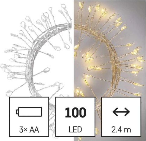 Рождественские цепи NANO на батарейках "ежик" - очевидный выбор для создания уютной атмосферы на различных праздничных мероприятиях, когда не хочется, чтобы общее впечатление от декора нарушал шнур питания. Благодаря тонкой проволоке красиво выделяются светлые части цепи, которые можно использовать для украшения различных частей интерьера, в том числе и праздничного стола. Ультратонкую проволоку можно согнуть по своему усмотрению и обернуть огоньки вокруг праздничного венка или любимой статуэтки на полке. Цепочка также станет стильным украшением и приятным освещением, если вставить ее в банку или фонарь. Рождественская цепь NANO оснащена батарейным блоком с выключателем и таймером, благодаря которому при включении цепь горит 6 часов, затем выключается и снова загорается через 18 часов.