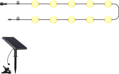 ArtFlow dekoratīvā solārā lampu virtene ir izsmalcināts risinājums āra un iekštelpu apgaismojumam, kas rada mājīgu un relaksējošu gaisotni dārzā, terasē vai jebkurā telpā. Virtene sastāv no desmit silti baltas gaismas bumbām, katra ar jaudu 1 W, kas izvietotas uz 7.74 metrus garas izturīga kabeļa. Lampām ir integrēts automātiskais taimeris un efektīvs 7 W saules panelis, kas nodrošina videi draudzīgu enerģijas risinājumu bez nepieciešamības pēc elektrības pieslēguma. IP55 aizsardzība garantē drošu lietošanu dažādos laikapstākļos. Tehniskie dati: