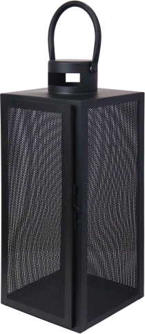 Melna laterna ar sietveida rakstu bez stikla. Laternu var pakārt uz turētāja vai novietot uz līdzenas virsmas. Tā atveras no sāniem, tas atvieglo sveces nomaiņu. Materiāls - metāls.