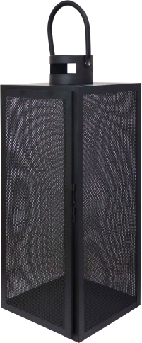 Melna laterna ar sietveida rakstu bez stikla. Laternu var pakārt uz turētāja vai novietot uz līdzenas virsmas. Tā atveras no sāniem, tas atvieglo sveces nomaiņu. Materiāls - metāls.