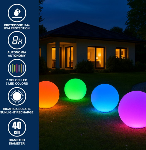 Украсьте свой двор с помощью Sfera — сферического солнечного светильника, сочетающего в себе эстетику и функциональность. Оснащенный датчиком сумерек, он автоматически включается с наступлением темноты и выключается при дневном свете, без необходимости подключения проводов или ручного управления. Белый или RGB-светильник создает живописный эффект, идеально подходящий для садов, подъездных путей, террас и бассейнов. Изготовленный из прочного пластика со степенью защиты IP44, светильник рассчитан на работу даже на открытом воздухе. Работает от солнечной батареи, заряжается за 8–10 часов и обеспечивает до 8 часов непрерывного освещения. В комплект входит литий-ионный аккумулятор емкостью 600 мА·ч. Диаметр: 40 см.