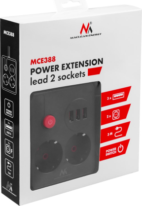 Maclean power strip, extender 2 sockets + 3xUSB, 110-240V AC 50/60Hz, 2.1A max 2500W, 3 m, black, MCE388 B