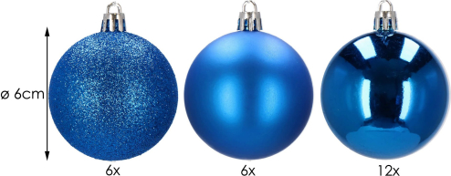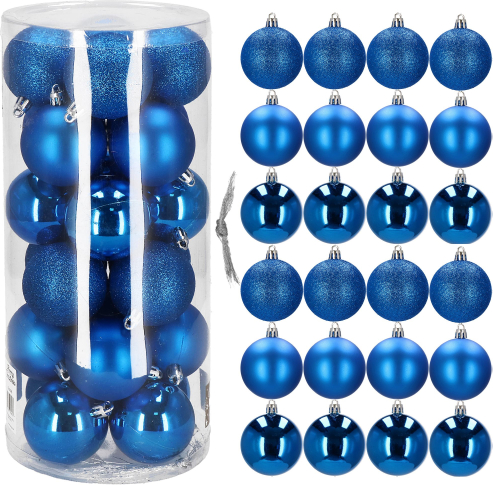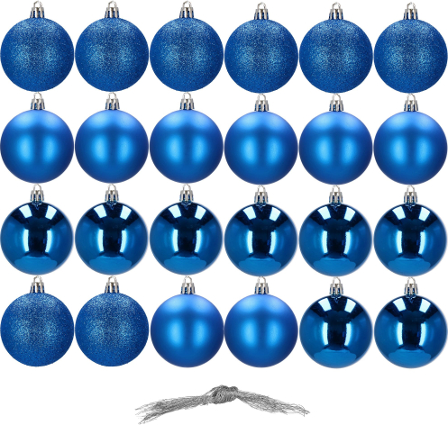 Бренд: Springos Цвет: синий Материал: пластик Размер: 6 см Количество: 24 шарика Дизайн: блестящие, глянцевые, матовые Преимущества: небьющиеся, серебристые шнурки для подвешивания в комплекте бесплатно