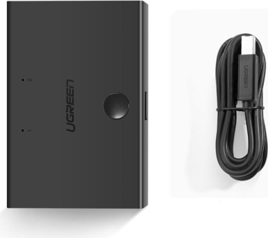 Ugreen switch switch 2xUSB-B - USB-A black (30345) The Ugreen allows you to process the signal from two computers or laptops to one peripheral device, such as a printer, plotter, external drive. The device does not require an external power supply. The built-in LED indicator informs us about which device is currently using the connection and we can easily switch between the two by pressing the button. The set includes two USB-B - USB-A 1.5m cables. The product does not require driver installation. The switch is compatible with most Windows, Linux and Mac OS systems. Specification: