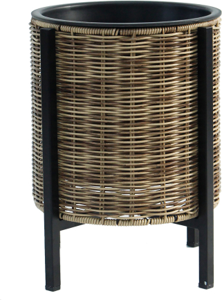 The metal frame of the plant holder is covered with plastic wicker.