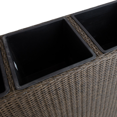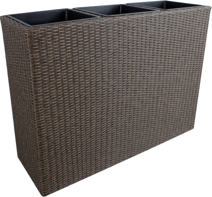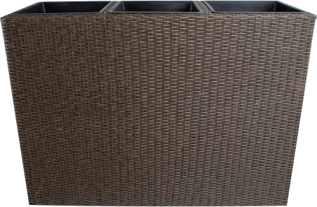 Ящик для цветов WICKER 110x39xH88см, тёмно-коричневый. Металлический каркас ящика для цветов обтянут пластиковым плетением. Размеры пластикового внутреннего горшка 30x30xH30см. Внутренний горшок без отверстия. В комплект входят 3 внутренних горшка. | ||||||||