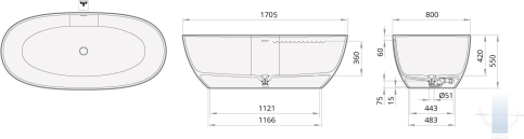 • Izmērs: 1705 x 800 mm, h = 550 mm