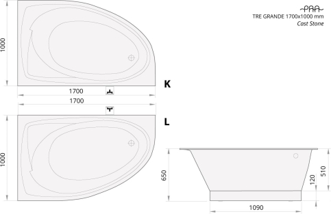 vanna TRE 170 D, 1700x1000 mm, labā puse, krāsaina akmens masas |