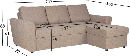 Overall dimensions of the sofa: 217x92/160xH88cm. The height of the sofa to the edge of the frame is 73cm. Seat width 123+56cm, seat depth 58/126cm. Seat height 45cm. The dimensions of the back cushion are 60x45x18cm. The dimensions of the sleeping area when opened are 137x179cm.