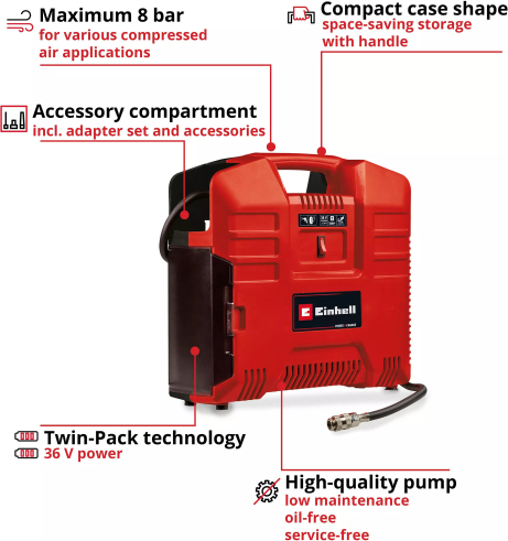 EINHELL Cordless Portable Compressor TE-AC 36/8 Li OF Set - Solo, 36Volt (2x18V) red, without battery and charger