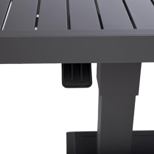 The height of the tabletop is adjustable using a shock absorber. The adjustment knob is located under the edge of the tabletop. To raise or lower the tabletop, press down on the button, rest your other hand on the center of the tabletop, and press gently. When the tabletop is at the desired height, release the knob.