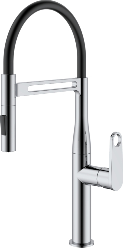 | Virtuves jaucējkrāns AB CHLOE ar augstu, elastīgu snīpi un spīdīgu hromētu pārklājumu ir praktisks un dizainiski izteiksmīgs risinājums virtuvei. Grozāmais un lokāmais snīpis ļauj ērti noskalot traukus vai izlietni, kā arī nodrošina maksimālu kustību brīvību ikdienas darbos. Vienas sviras vadība nodrošina vienkāršu ūdens plūsmas un temperatūras regulēšanu. Hromētais korpuss apvienots ar kontrastējošu melnu šļūteni, kas piešķir krānam modernu un profesionālu izskatu. Pateicoties vienkāršai montāžai, tas ir piemērots gan mājas virtuvēm, gan restorānu vai bāru vajadzībām. |