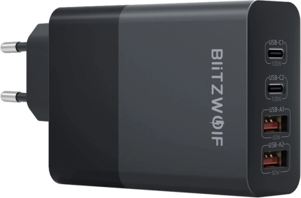 BlitzWolf BW-S29 120W mains charger (black)If you're tired of overloaded outlets and slow charging, the BlitzWolf BW-S29 will be your new favorite. This compact but extremely powerful mains charger offers up to 120 watts of total power and 4 ports: 2 x USB-C and 2 x USB-A. With it, you can power your laptop, phone, tablet and headphones at the same time - and at full speed.
