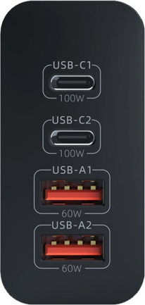 120 W of power in the palm of your handThe two USB-C ports provide up to 100 watts of power each, allowing you to charge PD laptops like MacBooks and Windows ultrabooks. The USB-A ports offer up to 60 watts - great for smartphones, powerbanks or portable consoles. Regardless of the combination, the charger intelligently distributes power for fast and safe charging.