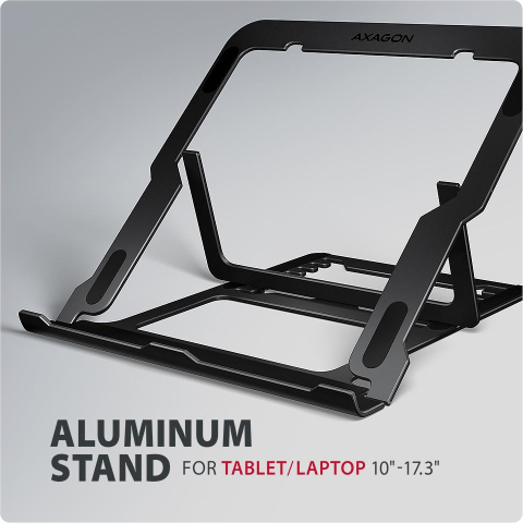 AXAGON STND-LAB is a stand for a laptop or tablet, which ensures comfort and improves ergonomics at work. It is ideal for devices with a screen from 10" to 17.3" and allows adjustment to up to eight positions. This makes it easy to find the ideal stand inclination for maximum relaxation of your neck and back muscles. Enjoy a comfortable working environment with a compact and portable stand that adapts perfectly to your needs whether you're working at home, in the office or on the go. The base is made of aluminium castings guaranteeing long life and reliability. Thanks to the non-slip finish, you don't have to worry about unwanted movements – your device stays firmly in place without damaging the surface of the laptop or the pad. These carefully designed features ensure perfect stability for your laptop, tablet or even your favourite book, giving you peace of mind and comfort during everyday use. A great advantage is the ability to adjust the stand to up to eight positions. This allows you to raise the laptop to a height from 91 to 150 mm. This gives you an additional work place at the correct eye level, which greatly improves ergonomics and comfort at work, while increasing your productivity. The stand can be easily folded into a compact size, making it convenient to carry wherever you need to go. Its elegant black design not only complements your desk in style, but also brings practical features you'll appreciate in everyday use. The design ensures optimal heat dissipation from your laptop, thereby improving its performance and extending its service life. Manufacturer Website: https://www.axagon.eu/en/products/stnd-lab | ||||||||||||||||||||||||||