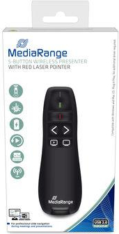 MediaRange Wireless presenter with red laser pointer and navigation buttons are perfect for professional lectures and presentations in the office, schools or auditoriums. The compact and stylish presenter can be connected via the USB dongle (Plug & Play) to your computer and allows you to move up to 15m around the room.