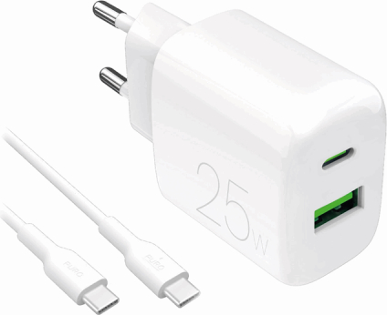 Wall Charger 1xUSB-A, 1xUSB-C, 25W with Cable USB-C to USB-C, 1,2m, by Puro White