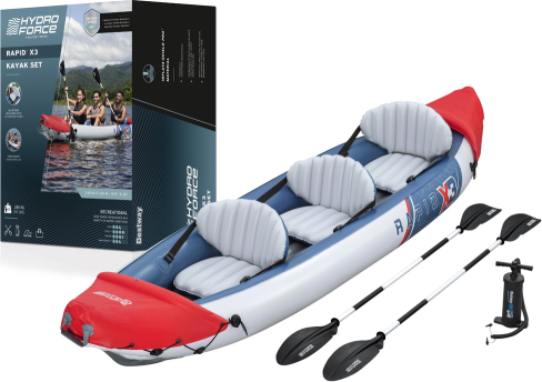 Bestway Inflatable Kayak 381 x 100 cm 65132 A trip to the water is an ideal form of spending free time. To diversify this carefree time, equip yourself with additional pool accessories. The kayak will also be perfect for a recreational trip on the lake or swimming pool. It was made of durable, damage-resistant vinyl. The comfortable cockpit has three inflatable seats with soft backs to keep you comfortable on long rides. Removable middle fin helps maintain directional stability. The form-fitting design prevents water from entering the cockpit and submerging you or your gear. A grab rope with built-in eyelets allows easy re-entry into the kayak from the water. The integrated drain valve makes it easy to deflate the kayak at the end of the day. You can also use heavy duty handles to carry the kayak while it is inflated. You will also receive a pair of 230cm aluminum oars and a repair patch to fix an accidental abrasion or puncture. Kit Contents: - inflatable kayak - oars - two fins - hand pump - repair patch Technical data: - Mattress dimensions: 381 x 100 cm - Maximum load 250 kg - two aluminum oars 230 cm - safety line - pumped floor - inflatable seat - a safety rope placed along the entire length Weight: 14 kg Size of the package: 62cm x 40 cm x 30 cm |