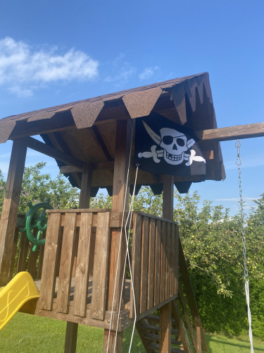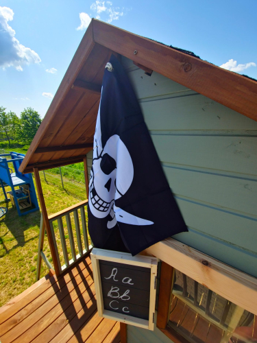 Šis karogs ir viens no tiem aksesuāriem, kas lieliski papildina mājas tuvumā uzstādītos rotaļlaukumus vai izveidotās rotaļu vietas, ļaujot izspēlēt dažādas ainas atkarībā no bērnu iztēles. Šis pirātu karogs liks jūsu bērnam justies kā īstam pirātu kuģa kapteinim, iztēlojoties, ka viņš atrodas pie Deivida Džounsa “Klejojošā holandieša” stūres.