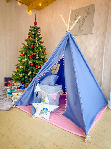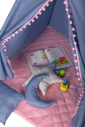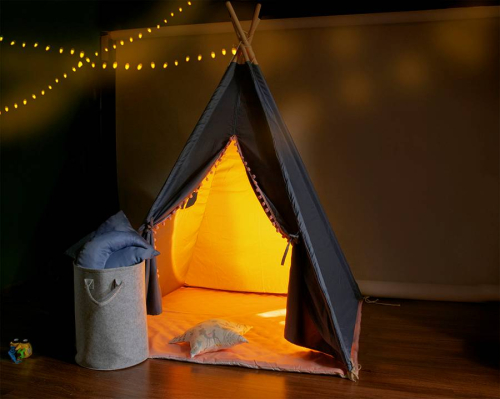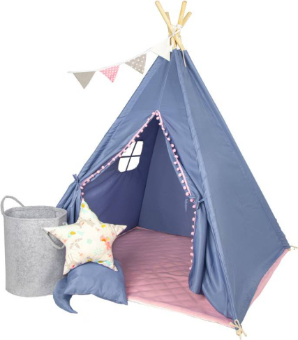 Stilīga, unikāla dizaina bērnu Tipi telts (vigvams) ir vieta īpašām spēlēm, klusai lasīšanai vai atpūtai. Bērnu telts ļaus iesaistīties dažādās spēlēs. Bērniem paredzēto Tipi telti var izmantot kā rotaļu stūrīti, kurā var paslēpties ne tikai bērni bet arī mīļākās rotaļlietas. Telts ātri un viegli saliekama, tāpēc lieliski piemērota lietošanai telpā, uz balkona vai pat ārā. Komplektā ietilpst: Tipi telts, trīs dažādu formu spilventiņi, soma rotaļlietām un karodziņi.