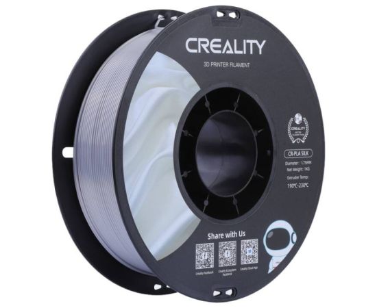 Creality CR-Silk PLA Filament (Silver)Creality's CR-Silk filament features a metallic, elegant sheen, making it eye-catching and perfect for printing figurines, decorations and even jewelry. It also features impressive durability and compatibility with most Creality printers. What's more, durable yet environmentally friendly materials have been used to make it.