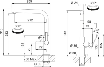 Franke virtuves maisītājs Maris Slim ar vienas sviras vadību un L-veida izteku ir matēti melnas krāsas un izgatavots no misiņa. Kopējais augstums ir 313 mm, montāžas atveres diametrs 35 mm, kārtridža izmērs 25 mm. Maisītājs aprīkots ar ūdens taupīšanas funkciju un lamināra tipa aeratoru. Uzstādīšanai izmanto stienīša stiprinājumu, ūdens savienojums 3/8", piegādātā ūdens šļūtene 450 mm gara. Maisītājs ir augstspiediena tipa, izteka grozāma 360°, sviras darbība sānos, ūdens plūsma pie 3 bar spiediena 10,2 l/min. |