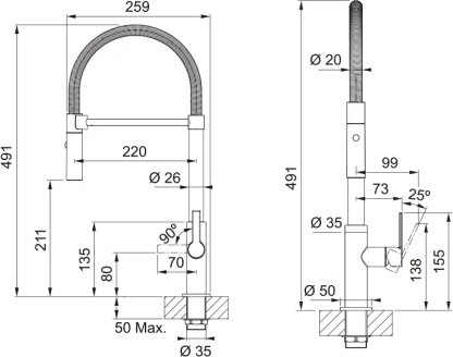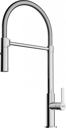 Franke virtuves maisītājs Maris Slim ar vienas sviras vadību un S-veida semi-profesionālu izteku ir hroma krāsā, izgatavots no misiņa, aprīkots ar izvelkamu metāla šļūteni un dušas galvu no misiņa. Kopējais augstums 491 mm, montāžas atveres diametrs 35 mm, kārtridža izmērs 25 mm. Maisītājs aprīkots ar ūdens taupīšanas funkciju un lamināra tipa aeratoru. Uzstādīšanai izmanto stienīša stiprinājumu, ūdens savienojums 3/8", piegādātā ūdens šļūtene 470 mm gara. Maisītājs ir augstspiediena tipa, ar izsmidzināšanas funkciju, sviras darbība sānos, izteka grozāma 360°, ūdens plūsma pie 3 bar spiediena 8,4 l/min. |