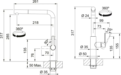 Franke virtuves maisītājs Maris Slim ar vienas sviras vadību un L-veida izteku ir matēti melnas krāsas, izgatavots no misiņa, aprīkots ar elastīgu izvelkamu šļūteni no melna neilona un dušas galvu no misiņa. Kopējais augstums 317 mm, montāžas atveres diametrs 35 mm, kārtridža izmērs 25 mm. Maisītājs aprīkots ar ūdens taupīšanas funkciju un lamināra tipa aeratoru. Uzstādīšanai izmanto stienīša stiprinājumu, ūdens savienojums 3/8", piegādātā ūdens šļūtene 450 mm gara. Maisītājs ir augstspiediena tipa, izvelkams, sviras darbība sānos, izteka grozāma 360°, ūdens plūsma pie 3 bar spiediena 8,3 l/min. |