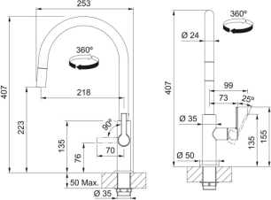 Franke virtuves maisītājs ar vienas sviras vadību un izvelkamu, apaļu izteku ir melnā krāsā un izgatavots no nerūsējošā tērauda. Kopējais augstums ir 407 mm, iztekas garums 218 mm, montāžas atveres diametrs 35 mm. Izteka grozāma par 360° nodrošina maksimālu kustības brīvību, un ūdens plūsma pie 3 bar spiediena ir 7,4 l/min. Maksimālais darba virsmas biezums: 50 mm. |