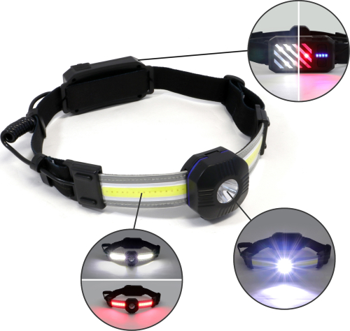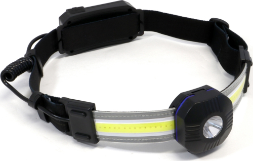 + light (125 g) and bright (500 lumen) Light and bright headlamp with rear light and LED strips on the sides. The rear light and front light can be operated separately. The rear light has 3 switchable modes: red light, white light and red-white flashing light. The front light has 7 different modes. The LED strips provide an even illumination of approx. 210°. The lamp head itself can be tilted up to 90°. A battery status indicator on the battery compartment shows the charge status of the battery. When the charge level is low, it starts to flash. Thanks to the USB Type-C connection, the built-in battery can be charged quickly. The charging cable is included in the scope of delivery.+ with rear light + lateral LED strips with approx. 210° illumination + many modes (red and white light / flashing light) + battery status display + USB Type-C connection