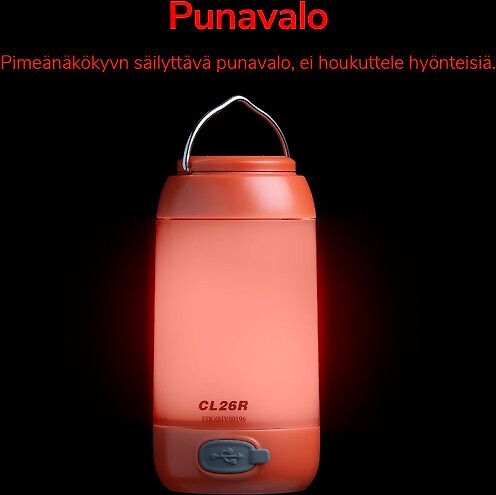 CL26R ir pilnībā pārveidota uzlādējama ceļojumu laterna no iepriekšējās ļoti ieteicamās un godalgotās laternas CL25R. Mūsu mērķis bija izveidot vēl daudzpusīgāku un augstas veiktspējas laternu, kas būtu piemērota visprasīgākajai lietošanai. CL26R laternai pirmo reizi ir aprīkots ar augstākās klases IDEMITSU objektīvu, kas maigi un plaši apgaismo platību līdz 25 metriem. Pateicoties daudzpusīgajām apgaismojuma funkcijām, CL26R ir piemērots lietošanai gan kā telts apgaismojums, gan kā nometnes apgaismojums! Lampas korpuss ir viegls, bet ļoti izturīgs BAYER PC2805 materiāls. Pārgājienu laternai CL26R ir seši dažādi spilgtuma režīmi un sarkanās gaismas funkcija. Sarkanā gaisma ir noderīga piem. kā lauka un nakts gaisma, jo tā saglabā redzamību vājā apgaismojumā un nepiesaista kukaiņus. Sarkano gaismu var redzēt pat 500 metru attālumā! CL26R apžilbina ar daudzpusīgajām apgaismojuma funkcijām. Laternai ir efektīva 360 grādu nometnes gaisma, 180 grādu apgaismojoša sānu gaisma un telts gaisma (uz kempinga laternas pamatnes). Ar nometnes gaismu jūs efektīvi izgaismojiet laukumu līdz 25 metriem, savukārt ar laternas sānu gaismu jūs netraucēsiet, piemēram, blakus guļošajam. Laternas apakšā izvietotais telts apgaismojums piedāvā prožektoru, kas piemērots piekarināšanai kā telts griestu apgaismojums vai pat kā rokas lampa! CL26R ir daudzpusīgas stiprinājuma iespējas, tostarp cilpas stiprinājums, statīva stiprinājums un jaudīgs magnētiskais stiprinājums. Visas CL26R ceļojumu laternas darbības funkcijas ir viegli un vienkārši pieejamas no viena funkciju taustiņa. Tāpēc pārgājienu laternas lietošana ir vienkārša pat tumsā! CL26R darbojas ar vienu standarta 18650 litija jonu akumulatoru vai diviem CR123A akumulatoriem, kas ir īpaši aukstumizturīgi. Ceļojuma laternai CL26R ir ātrs mikro USB uzlādes savienotājs, ar kuru jūs varat ātri uzlādēt lampu no elektrotīkla, rezerves barošanas avota, automašīnas utt. CL26R ir laterna, kas paredzēta lietošanai visu gadu. Kempinga laternai ir īpaša konstrukcija, kas pasargā akumulatoru no aukstuma. Turklāt iespēja izmantot CR123A baterijas vēl vairāk palielina lietojamību ļoti zemās temperatūrās.