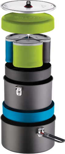 Katli, kas izgatavoti no izturīga, cieti anodēta alumīnija Komplektā ietilpst 2 katli, 1 katla vāks, 1 katlu rokturis, 3 dziļie šķīvji, 3 krūzes Katla vāks ar caurumiem nokāšanai
