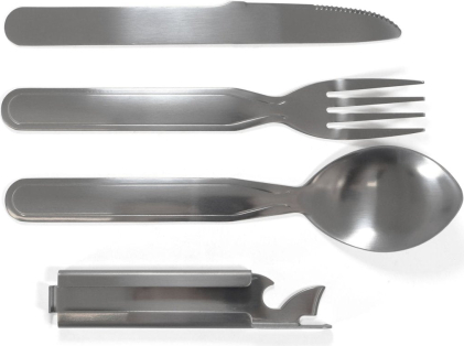 Ēšanas piederumu komplekts kempingam Izgatavoti no nerūsējošā tērauda. Aprīkoti ar bundžu un pudeļu attaisāmo. Kompakti savienojas kopā. Svars: 155 grami Garums: 18.5 cm