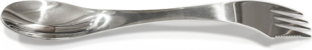 Nerūsējošā tērauda 3-vienā ēšanas piederums: dakša, karote un nazis. Pateicoties ergonomiskajam dizainam, to ir ērti lietot, savukārt noapaļotās malas nodrošina papildu drošību un patīkamu sajūtu ēšanas laikā. Lai gan daudzfunkcionāls, Spork nazis ir īpaši vietas taupošs un to var viegli uzglabāt jebkurā somā, pusdienu kastītē vai mugursomā. Svars: 50 grami Izmērs: 20.2 x 3.6 x 1.5 cm Materiāls: nerūsējošais tērauds |