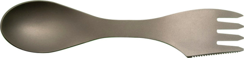 Titāna ēšanas piederums- dakškarote jeb spork. Dakšas sānos zobains nazītis.