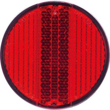 Sarkans, apaļas formas velosipēda aizmugurējais atstarotājs. C.P.S.C. / BS / UN IA / StVZO / JIS / GB apstiprināts.