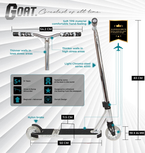 Izgatavots no absolūti labākajiem materiāliem, ko izmanto triku skrejriteņos, GOAT lepojas ar īpaši vieglu konstrukciju, kas padara to viegli lietojamu un manevrējamu. Galvenās funkcijas: