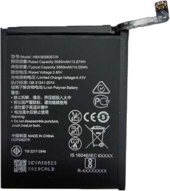 | Эти батареи имеют более короткое время зарядки и более длительный срок службы. Батареи не обладают «эффектом памяти», поэтому телефоны можно заряжать в любое удобное для пользователя время. Заряжайте быстрее - используйте дольше - чувствуйте себя в большей безопасности! Особенности: Аккумулятор защищен от перезаряда, перегрева и возгорания. Оптимально подобранные параметры разряда для максимальной емкости аккумулятора. Совместимые модели: Huawei P30. Huawei ELE-AL00. Huawei ELE-AL10. Huawei ELE-L04. Huawei ELE-L09. Huawei ELE-L29. Huawei ELE-TL00. Примечания: список совместимых аккумуляторов и смартфонов может быть неполным. В случае сомнений всегда обращайтесь за советом к консультанту. Совместимые партномера: HB436380ECW. Технические характеристики: Емкость: 3650 мАч. Тип: литий-ионный. Напряжение: 3,85 В. Гарантия: 12 месяцев. Важная информация! Использованные аккумуляторы и батареи следует утилизировать в специальных контейнерах, помеченных знаком сбора аккумуляторов. |