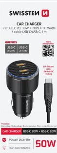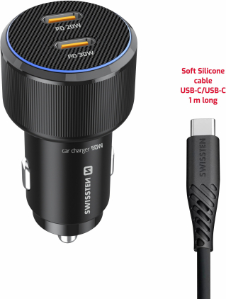 Высокопроизводительное автомобильное зарядное устройство с двумя портами USB-C и поддержкой PD 3.0, поставляется с высококачественным кабелем USB-C/USB-C (1 м, 60 Вт, 3 А, мягкий силикон). Общая выходная мощность до 50 Вт. Синее светодиодное кольцо обеспечивает удобство использования даже в условиях низкой освещенности.