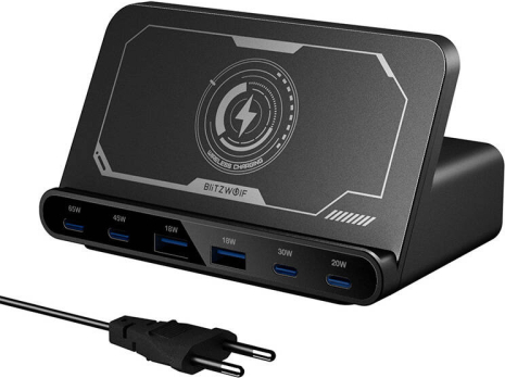 Blitzwolf BW-S27 160W, 2xUSB-A, 4xUSB-C, 15W wireless charger (black)The BlitzWolf BW-S27 network charger is a powerful charging tool that easily meets the demands of even the most demanding users. Equipped with six ports (4x USB-C and 2x USB-A) and a wireless charging cradle - it allows you to charge several devices simultaneously. It also stands out for its maximum output power of 160 watts and wide compatibility.