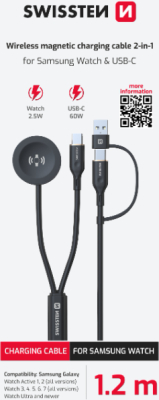 Магнитный кабель SWISSTEN 2in1 разработан для быстрой и удобной зарядки Samsung Galaxy Watch и устройств с разъёмом USB-C. Благодаря съёмному адаптеру USB-A/USB-C его можно легко подключить к широкому спектру зарядных устройств и портов. При использовании USB-C он обеспечивает мощность до 60 Вт для телефонов, планшетов и ноутбуков и до 2,5 Вт для часов. Гибкий силиконовый кабель длиной 1,2 м прочный, приятный на ощупь и устойчив к спутыванию.