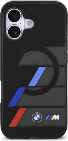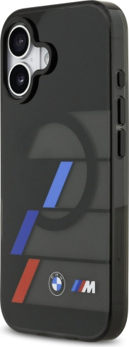 На задней крышке изображен фирменный мотив BMW M — геометрическая графика с полупрозрачными полосами цветов M (синий, темно-синий и красный) и логотип BMW M, подчеркивающий аутентичность продукта.