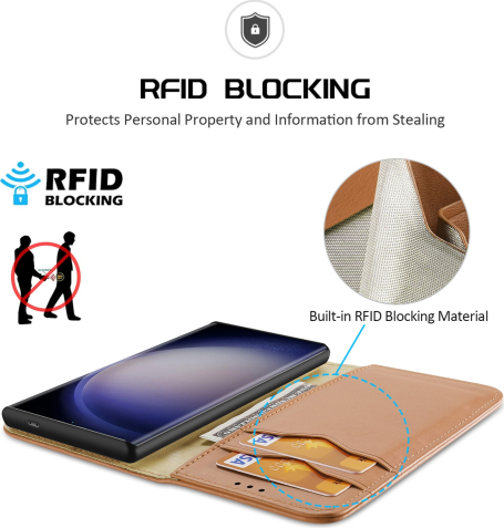 Made of genuine leather with RFID blocking material to protect personal property and information from being stolen. |