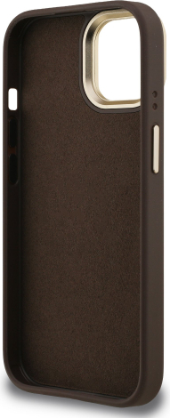Guess PU 4G Metal Logo Stand Camera Frame Case Защитный чехол для iPhone 15 / коричневый