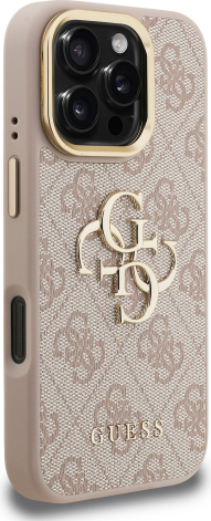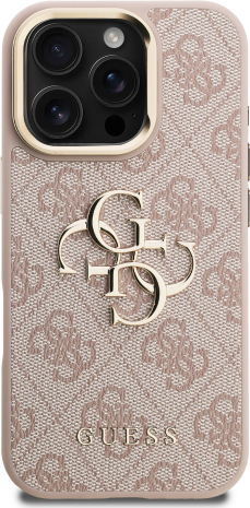 Guess PU 4G Metal Logo Stand Camera Frame Case Защитный чехол для iPhone 16 Pro Max / розовый